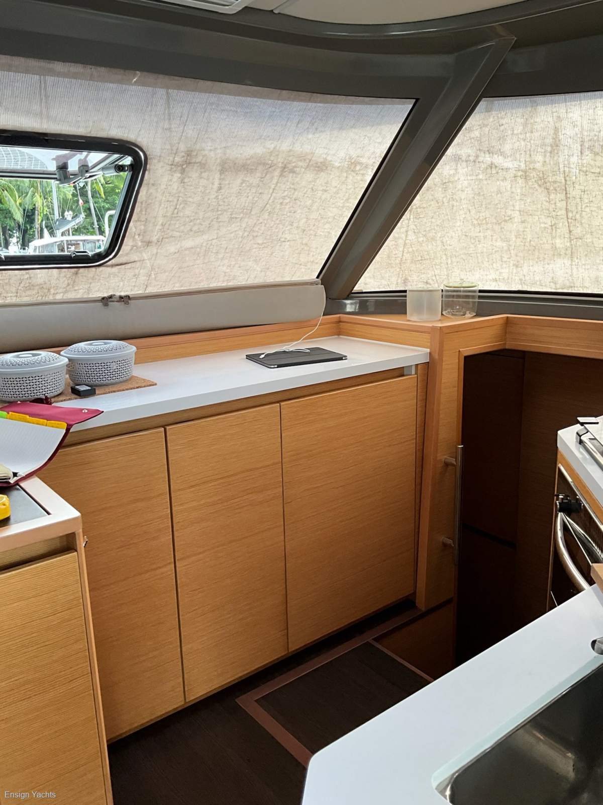 LAYOUT: Galley on starboard side, facing forward and towards cockpit
