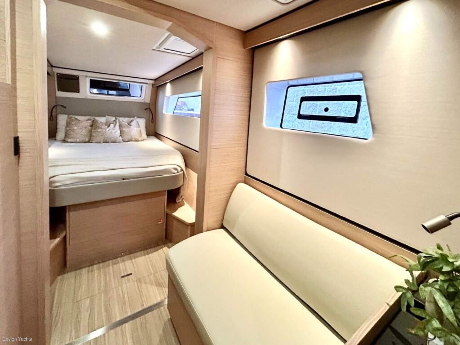 The outstanding Owners Suite is located in the port hull and offers a private, spacious, luxurious finish, generous storage and an abundance of natural light across the elegant cabin with a separate bathroom and toilet with its dedicated hand wash basin.