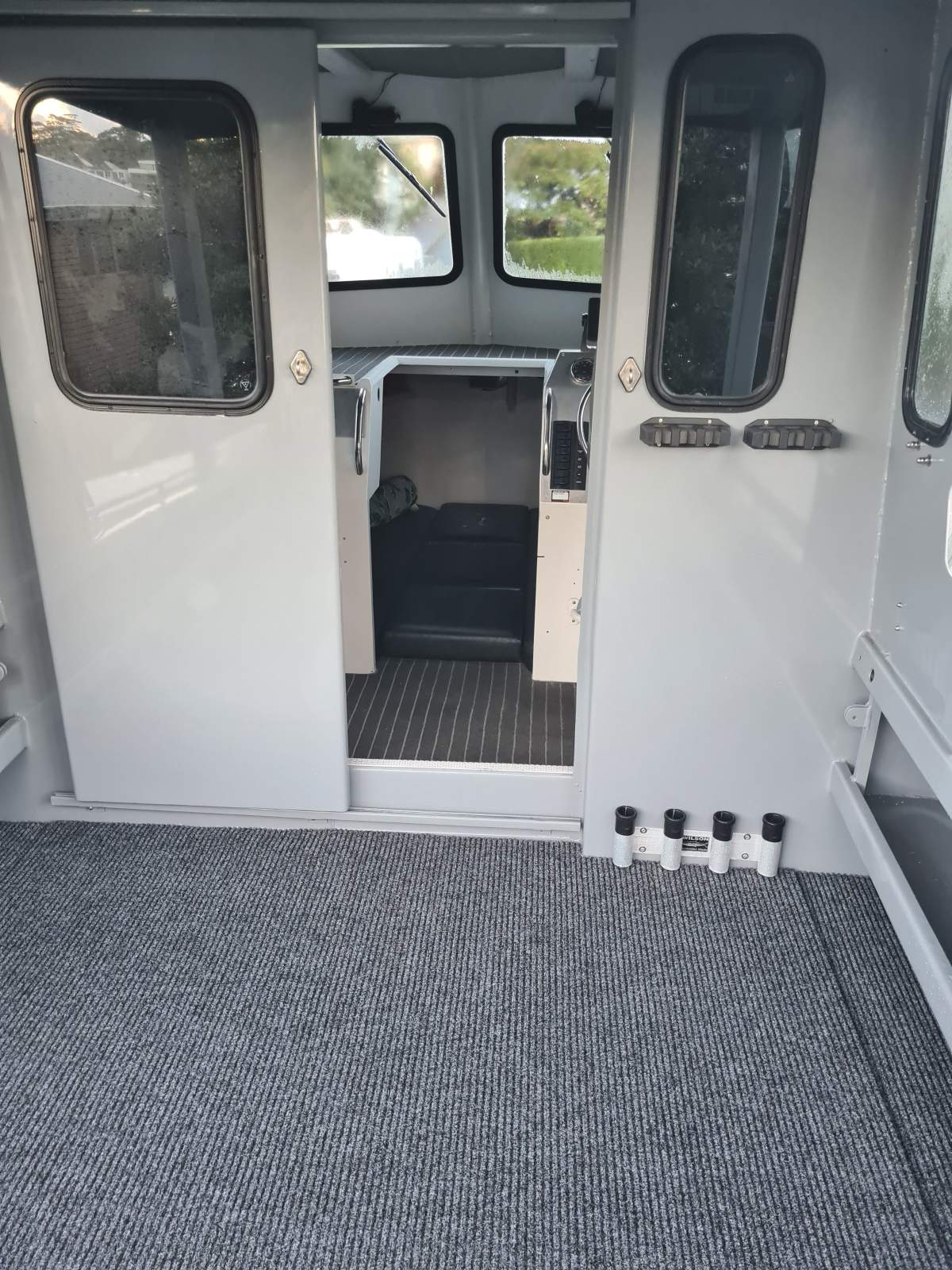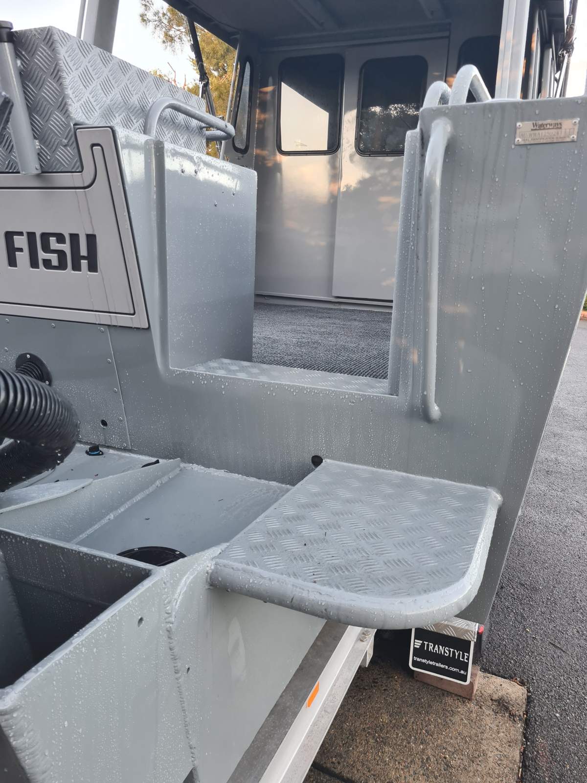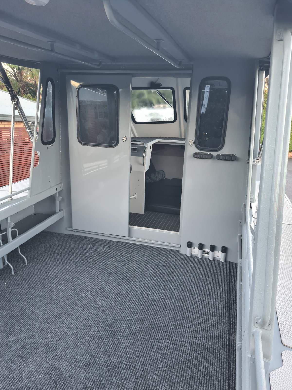 Forward V berth, chemical toilet, cockpit Port/Starboard sliding doors, self draining deck, bait board, loads of storage, twin transom doors.