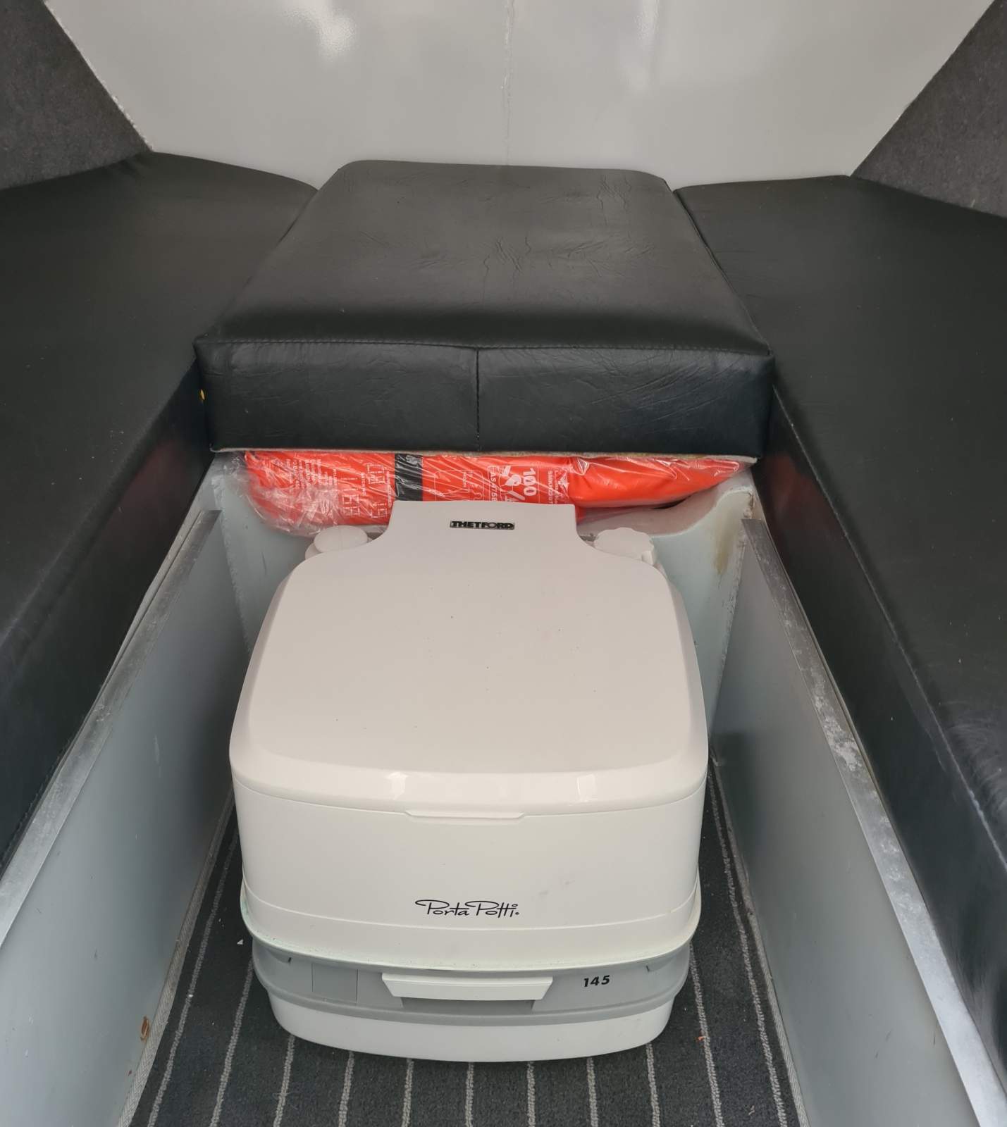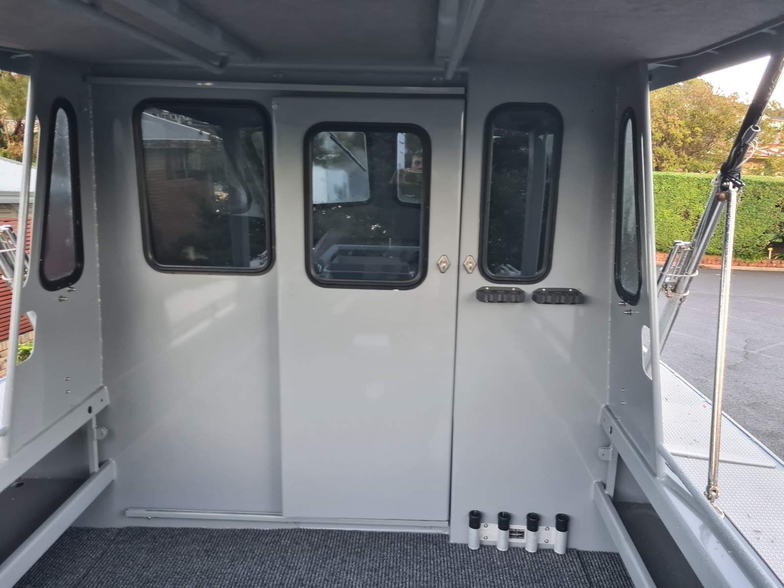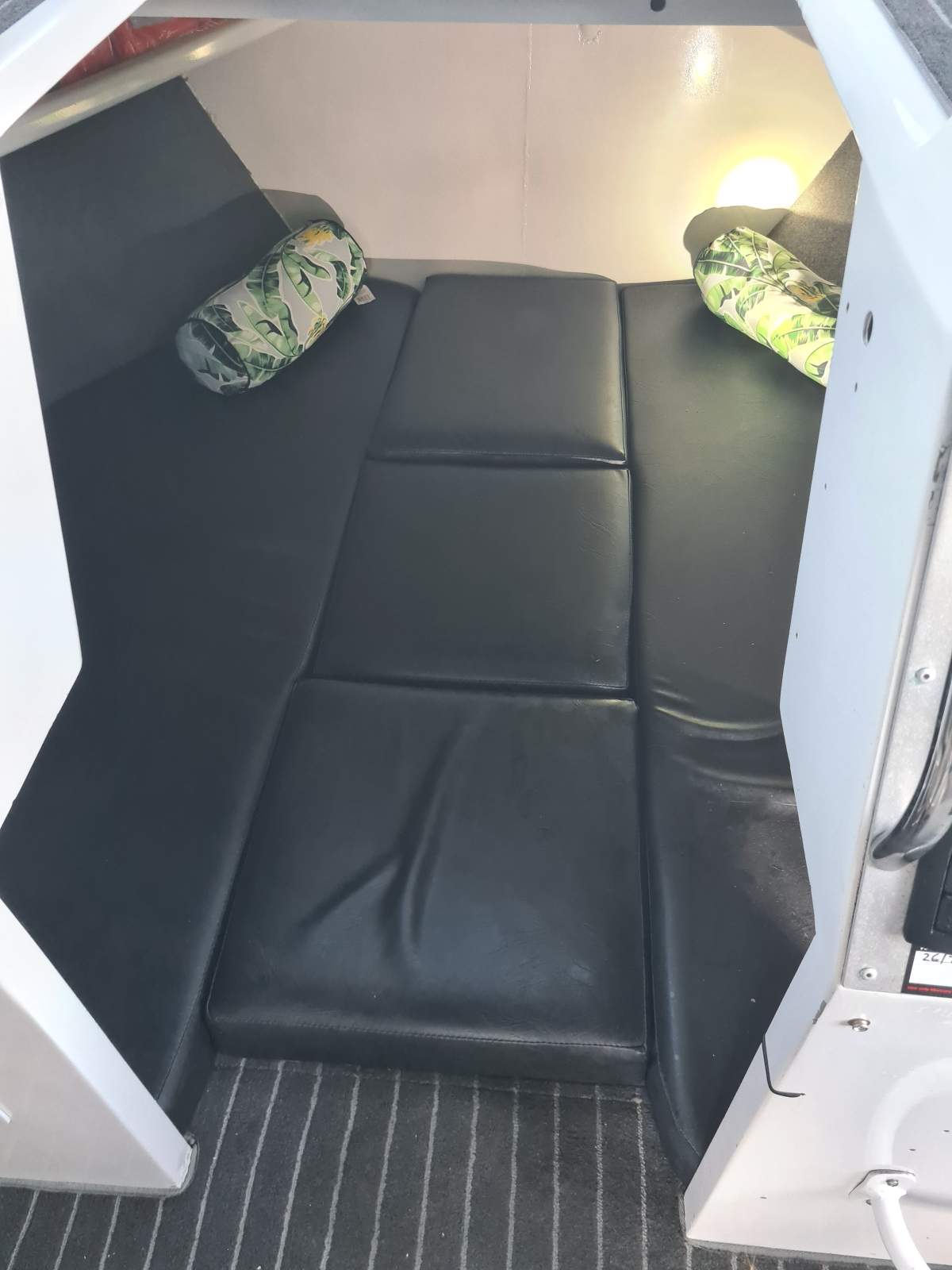 Forward V berth, chemical toilet, cockpit Port/Starboard sliding doors, self draining deck, bait board, loads of storage, twin transom doors.